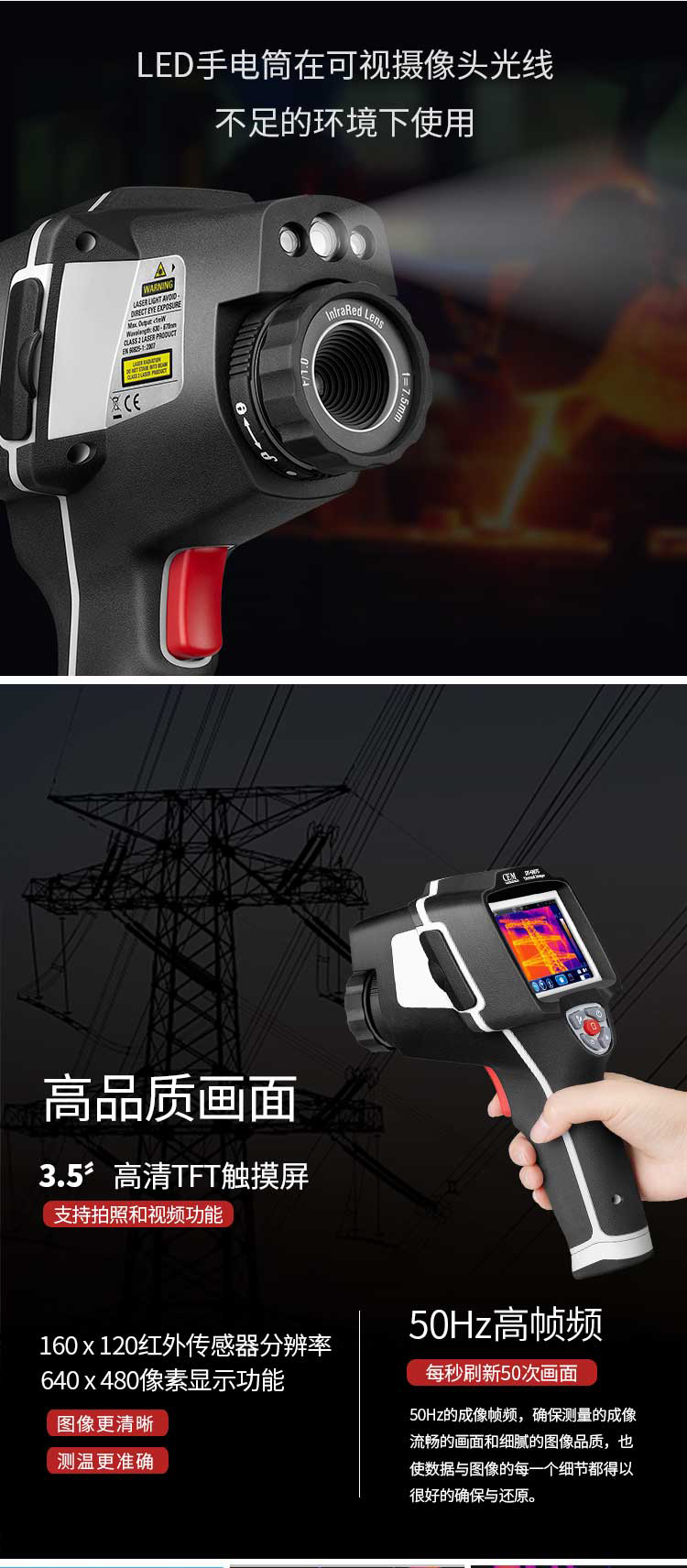 標(biāo)配鏡頭7.5mm,分辨率160×120,IFOV:3.33mard,視場(chǎng)角29.8×22.6°,熱靈敏度NETD<0.08℃,圖像幀頻50Hz,溫度范圍(-20-150、0-400),可見光分辨率640×480像素
