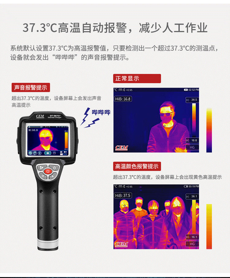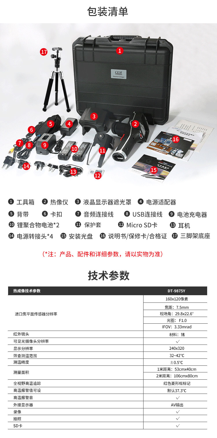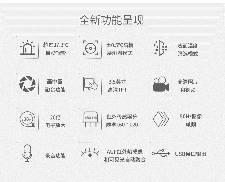 分辨率:160*120、圖像幀頻:50HZ、篩查測溫范圍:32-42℃、AV輸出大屏全屏顯示