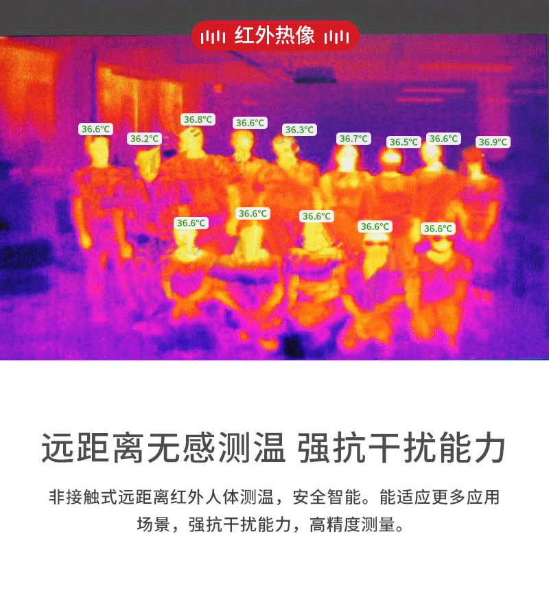 熱成像篩查原理1.紅外輻射原理 自然界中一切溫度高于絕對零度(負(fù)273.15攝氏度)的物體都會輻射紅外能量,熱成像儀只是被動接受人體輻射出來的紅外能量,對人體和環(huán)境是沒有任何危害的。 2.紅外熱成像儀原理 紅外熱像儀將紅外熱輻射轉(zhuǎn)換成電信號,經(jīng)過系統(tǒng)電路的處理,在顯示器上通過肉眼可見的RGB顏色顯示出來,實(shí)質(zhì)上是將不可見的紅外輻射轉(zhuǎn)換為可見的熱圖像,并配以溫度顯示。 3.熱成像篩查的優(yōu)勢與注意事項(xiàng) 熱成像可以對其視場角范圍內(nèi)的多目標(biāo)同時(shí)進(jìn)行體溫測量,減少人員接觸,安全效率高,但它的精度受到外界環(huán)境影響,所以應(yīng)用時(shí)應(yīng)該保持環(huán)境穩(wěn)定。 4.人體溫度篩查原理 篩查系統(tǒng)首先通過人臉檢測技術(shù),獲取人臉的區(qū)域。然后通過熱成像獲取人臉區(qū)域額頭溫度。這樣可以將人臉和溫度關(guān)聯(lián)起來。 需要注意的是: 1)人的體內(nèi)溫度通常在35°℃~37°C范圍內(nèi)波動,受到環(huán)境,運(yùn)動狀態(tài)等影響會出現(xiàn)體溫的波動,需要被測人員處于穩(wěn)定的環(huán)境中,避免劇烈運(yùn)動。 2)由于是采集人臉額頭,所以被測人員不要遮擋額頭,戴口罩不影響測量。