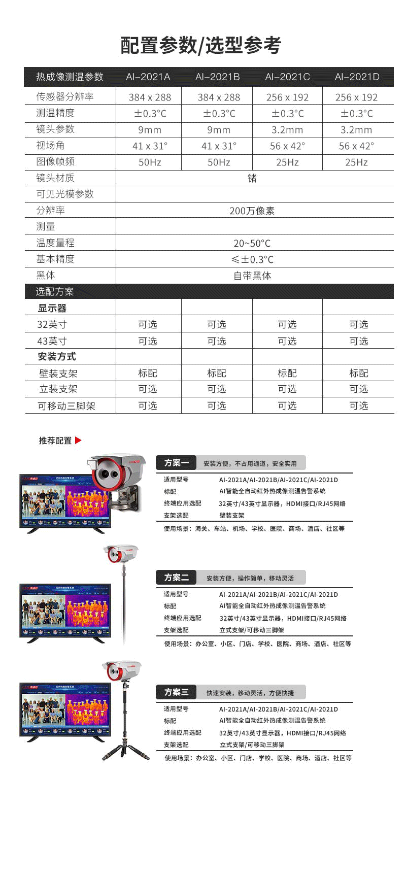 2安裝與維護(hù) 2-1,紅外熱像告警系統(tǒng)部署原則 AI-2021紅外熱像告警系統(tǒng)屬于精密測溫和成像設(shè)備,對部署應(yīng)用有一定要求,注意事項(xiàng)如下: ·安裝環(huán)境:設(shè)備機(jī)頭所處位置需光線良好(照明度≥10OLux),應(yīng)避免處于逆光的位置;設(shè)備機(jī)頭布置位置附近3米范圍內(nèi)不應(yīng)有空調(diào)出風(fēng)口;設(shè)備機(jī)頭所監(jiān)控的視場內(nèi),不能受到光照、西曬等外界強(qiáng)熱源的干擾; ·機(jī)頭布置:合理布置AI-2021機(jī)頭的位置,向下俯視角度為13°~15°;合理布局人員檢測位置和范圍,Al-2021機(jī)頭的攝像頭距離被測人員的額頭的位置為1.0~5.0米,最佳測試位置為2.0米; ·被測人員要求:戶外陽光照射后,或者劇烈運(yùn)動后,需在室內(nèi)環(huán)境平靜適應(yīng)5分鐘后進(jìn)行測試;人員從戶外場景進(jìn)入室內(nèi),建議經(jīng)過回廊緩沖至少10秒鐘后,再步入檢測位置,如果室內(nèi)外溫差較大時(shí),建議在室內(nèi)停留2~3min再行檢測;確保待測人員整個(gè)面部處于設(shè)備攝像視野內(nèi),同時(shí)面部及額頭不能被遮擋(帽子、圍巾、墨鏡、面具、退燒貼等可能遮擋面部的物件,建議先提前摘下,適應(yīng)0.5-1分鐘后再進(jìn)行測試。)