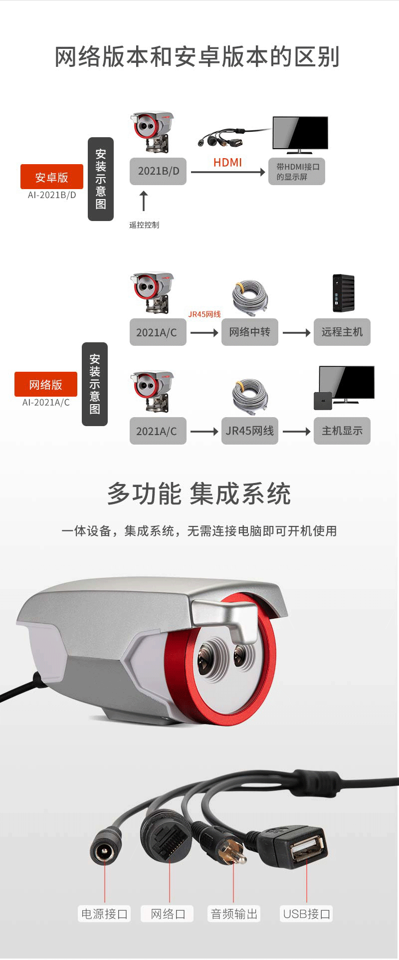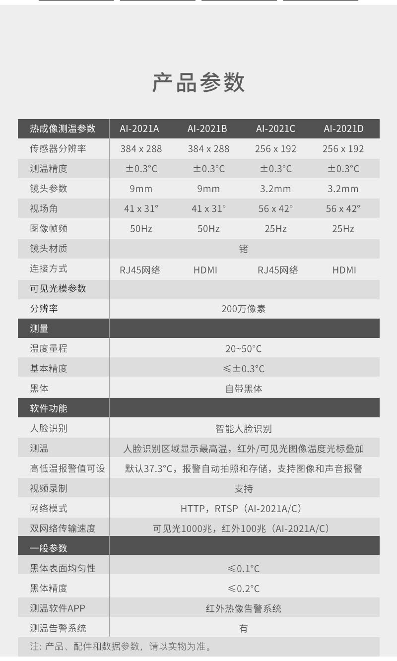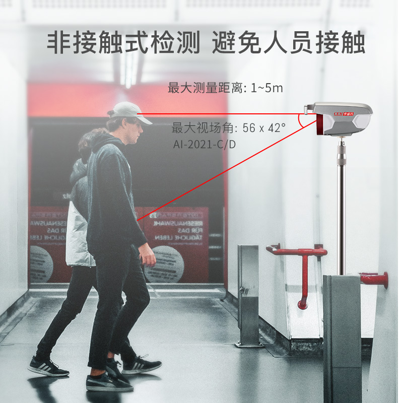 2安裝與維護(hù) 2-1,紅外熱像告警系統(tǒng)部署原則 AI-2021紅外熱像告警系統(tǒng)屬于精密測溫和成像設(shè)備,對部署應(yīng)用有一定要求,注意事項(xiàng)如下: ·安裝環(huán)境:設(shè)備機(jī)頭所處位置需光線良好(照明度≥10OLux),應(yīng)避免處于逆光的位置;設(shè)備機(jī)頭布置位置附近3米范圍內(nèi)不應(yīng)有空調(diào)出風(fēng)口;設(shè)備機(jī)頭所監(jiān)控的視場內(nèi),不能受到光照、西曬等外界強(qiáng)熱源的干擾; ·機(jī)頭布置:合理布置AI-2021機(jī)頭的位置,向下俯視角度為13°~15°;合理布局人員檢測位置和范圍,Al-2021機(jī)頭的攝像頭距離被測人員的額頭的位置為1.0~5.0米,最佳測試位置為2.0米; ·被測人員要求:戶外陽光照射后,或者劇烈運(yùn)動后,需在室內(nèi)環(huán)境平靜適應(yīng)5分鐘后進(jìn)行測試;人員從戶外場景進(jìn)入室內(nèi),建議經(jīng)過回廊緩沖至少10秒鐘后,再步入檢測位置,如果室內(nèi)外溫差較大時,建議在室內(nèi)停留2~3min再行檢測;確保待測人員整個面部處于設(shè)備攝像視野內(nèi),同時面部及額頭不能被遮擋(帽子、圍巾、墨鏡、面具、退燒貼等可能遮擋面部的物件,建議先提前摘下,適應(yīng)0.5-1分鐘后再進(jìn)行測試。)