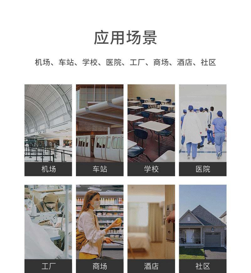 注意事項(xiàng) 紅外熱像告警系統(tǒng)應(yīng)正確安裝,可自動跟蹤人體額頭區(qū)域并顯示體溫,操作人員應(yīng)經(jīng)生產(chǎn)廠家專業(yè)培訓(xùn),并嚴(yán)格按說明書使用。 ·應(yīng)嚴(yán)格按照中國國標(biāo)(GB_T19146-2010)和各地市場監(jiān)管局的要求創(chuàng)造使用條件;·嚴(yán)格按照規(guī)范要求,安裝在室內(nèi)無風(fēng)或者微風(fēng)的固定位置使用,室溫環(huán)境在16°℃~32°C,避免陽光、風(fēng)和其他熱源干擾(環(huán)境溫度超出16°℃~32°℃,需要安裝空調(diào),并在產(chǎn)品3m內(nèi)無風(fēng)或者微風(fēng)); ·若安裝在室外,必須搭建棚子或者板房來保證環(huán)境穩(wěn)定; ·戶外陽光照射后、劇烈運(yùn)動后或從溫差較大的戶外場景進(jìn)入室內(nèi),需在室內(nèi)環(huán)境平靜靜置5分鐘后進(jìn)行測試。