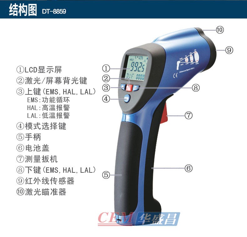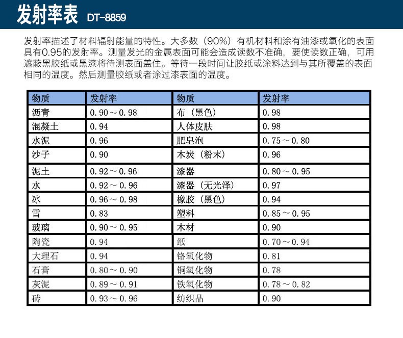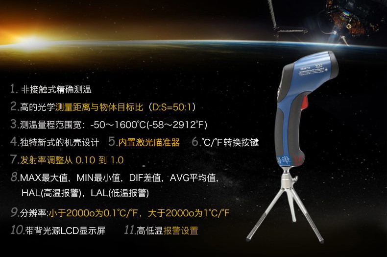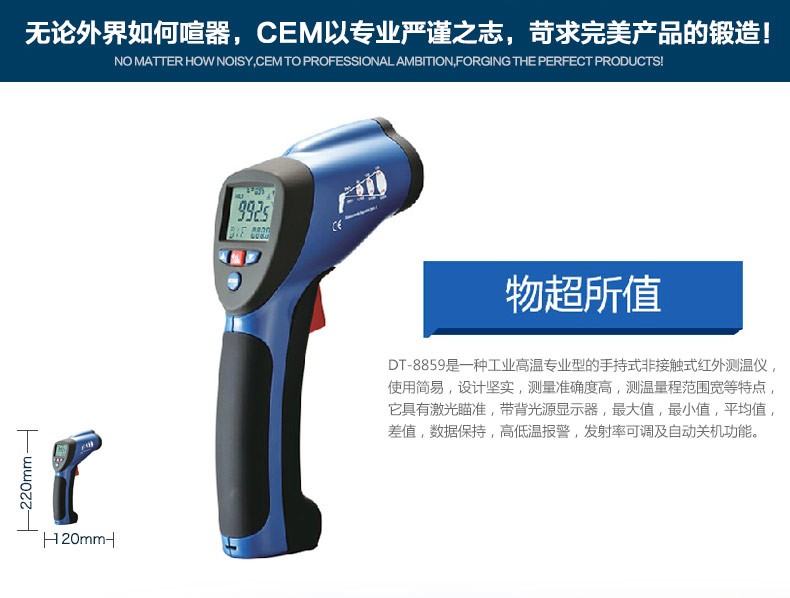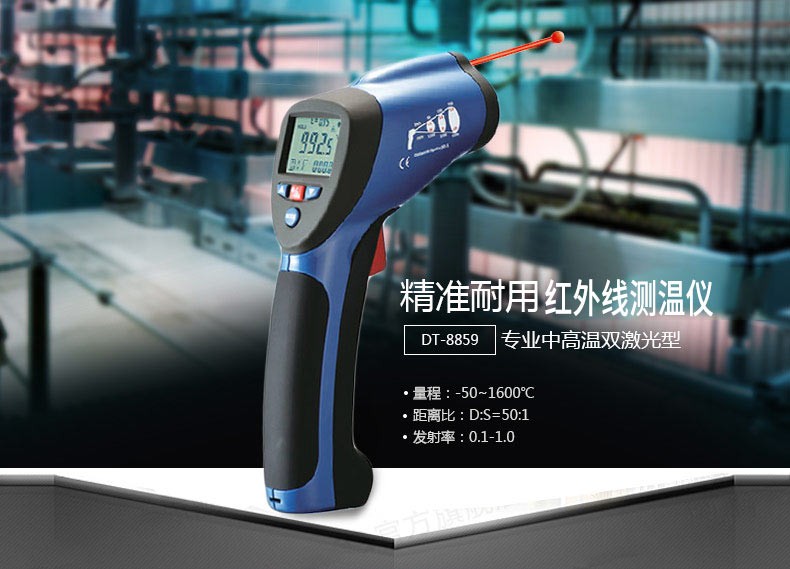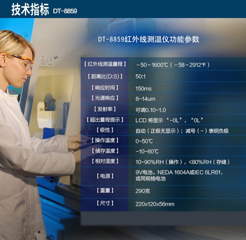 DT-8829紅外線測溫儀一種專業(yè)型的手持式非接觸紅外線測溫儀,使用簡易,設(shè)計堅實,測量準(zhǔn)確度高,測溫量程范圍寬等特點。它具有激光瞄準(zhǔn),帶背光源顯示器,最大值,最小值,平均值,差值,數(shù)據(jù)保持,高低溫報警,發(fā)射率可調(diào)及自動關(guān)機功能。該手持式非接觸紅外線測溫儀可用于測量那些不適合使用傳統(tǒng)接觸式測量方法來測量物體的表面溫度(例如移動物體,帶電表面和難以接觸到的物體)。特征:非接觸式精確測溫高的光學(xué)測量距離與物體目標(biāo)比(D:S-16;1/50:1)測溫量程范圍寬獨特新式的機殼設(shè)計內(nèi)置激光瞄準(zhǔn)器自動數(shù)值保持℃/F轉(zhuǎn)換按鍵發(fā)射率調(diào)整從0.10 到1.0,(8829固定在0.95)MAX,MIN,DIF,AVG 溫度顯示帶背光源LCD顯示屏自動選擇量程,分辨率為0.1