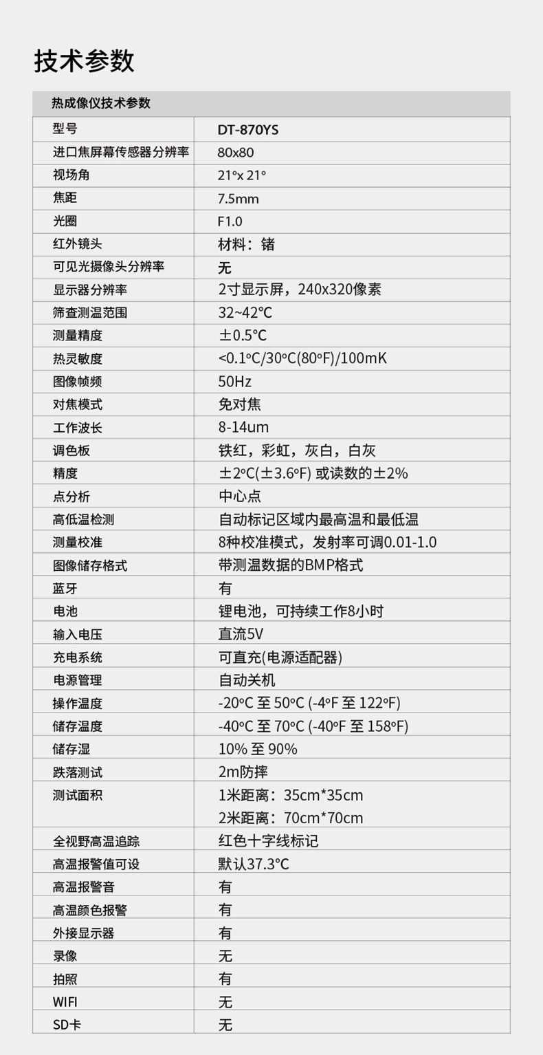 分辨率:80*80、圖像幀頻:50HZ、篩查測(cè)溫范圍:32-42℃、DT-8780YS外接10.1英寸PAD大屏,可實(shí)現(xiàn)多人同時(shí)測(cè)溫,AI人臉識(shí)別