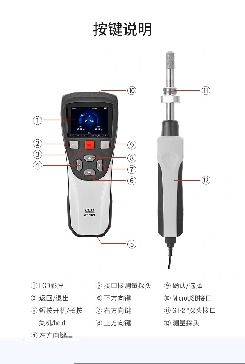 產(chǎn)品概述 CEM DT-8321是CEM華盛昌新設(shè)計(jì)、研發(fā)和制造的一款高精度專業(yè)手持式露點(diǎn)儀,精度高范圍廣,能在較寬的測量范圍內(nèi)準(zhǔn)確測量露點(diǎn)溫度,探頭可直接插入加壓過程中,并快速響應(yīng)測試過程環(huán)境條件,為工業(yè)露點(diǎn)測量應(yīng)用提供準(zhǔn)確快速的測量。產(chǎn)品廣泛應(yīng)用于實(shí)驗(yàn)室、電力電氣、SF6氣體測量、精密制造、化工制藥等領(lǐng)域的大溫度、大壓力范圍內(nèi)的直接過程露點(diǎn)測量。 產(chǎn)品優(yōu)勢 性能穩(wěn)定,維修成本低,可專業(yè)用于工業(yè)現(xiàn)場檢測和戶外校驗(yàn)等場合。 高品質(zhì)傳感器,測量更準(zhǔn)確,適用于低露點(diǎn)測量。測量范圍達(dá)-50至+30°C,低濕度測量<5%RH?!駛鞲衅骺沙惺苣Y(jié),無需擔(dān)心結(jié)露影響測量精度。 傳感器探頭具備凈化功能以及加熱功能,預(yù)熱時(shí)間短,測量結(jié)果更穩(wěn)定。 靈活的數(shù)據(jù)記錄功能,可設(shè)置自動(dòng)記錄間隔,CSV文件可以通過USB傳輸?shù)絇C端。 測量數(shù)據(jù)可一鍵保存,可使用電腦中的Excel軟件查看。 外形堅(jiān)固,緊湊,小巧,外加藍(lán)色彩屏設(shè)計(jì),界面更加直觀簡潔。 可充電設(shè)計(jì),持久續(xù)航更方便。