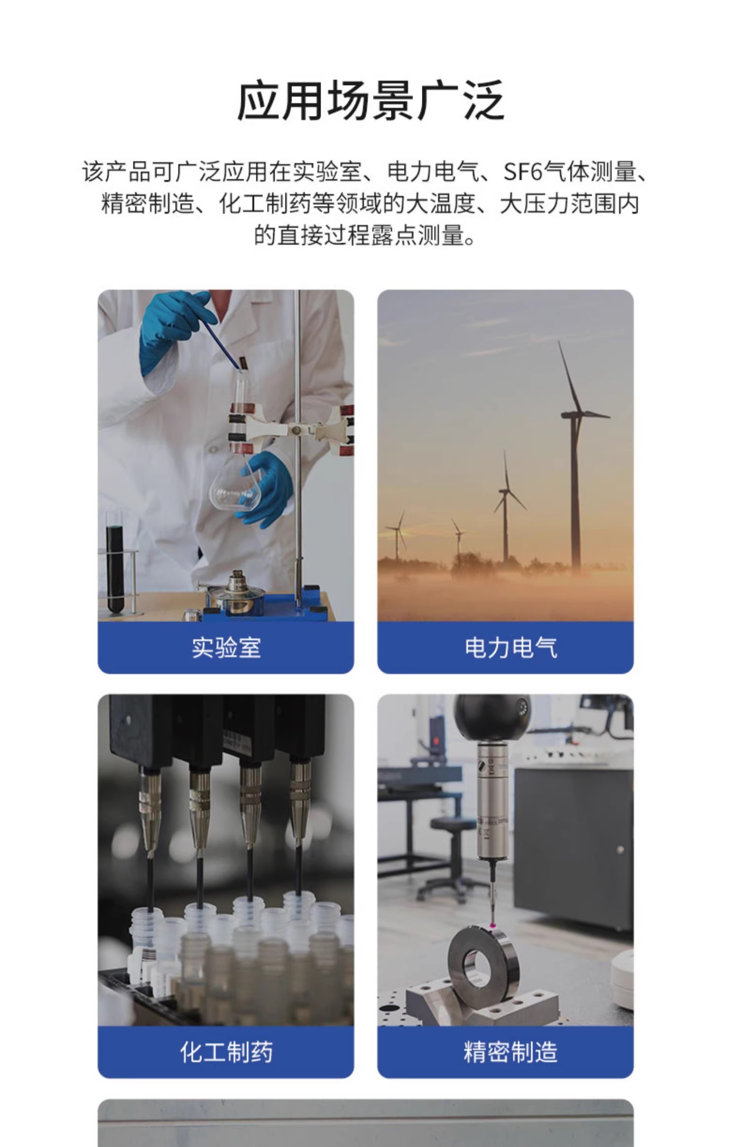產(chǎn)品應(yīng)用 手持式露點(diǎn)儀是一種便捷、準(zhǔn)確、可靠的空氣濕度測量設(shè)備,其在實(shí)驗(yàn)室、工業(yè)生產(chǎn)、環(huán)境監(jiān)測等領(lǐng)域中具有廣泛的應(yīng)用前景。 實(shí)驗(yàn)室 在化學(xué)、生物、醫(yī)學(xué)等實(shí)驗(yàn)室中常常需要測量空氣中的相對濕度和露點(diǎn)溫度以掌握實(shí)驗(yàn)條件。 工業(yè)生產(chǎn) 在制造、加工、儲(chǔ)存等工業(yè)領(lǐng)域中,可用于監(jiān)測空氣中的水分含量,保障生產(chǎn)過程的穩(wěn)定性和質(zhì)量。 環(huán)境監(jiān)測 在氣象、環(huán)保、建筑等領(lǐng)域中,可用于監(jiān)測大氣中的相對濕度、露點(diǎn)溫度等指標(biāo),以便更好地了解環(huán)境狀態(tài)。 工業(yè)應(yīng)用 諸如空氣干燥設(shè)備、塑料注塑設(shè)備、手套箱干燥設(shè)備、鋰電池水分檢測、氫氣、二氧化碳、水份檢測等。