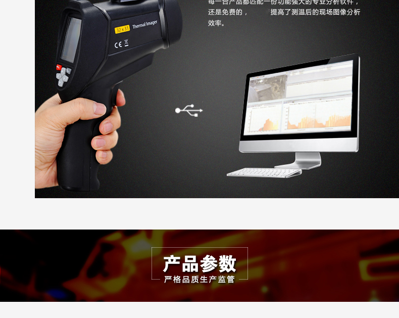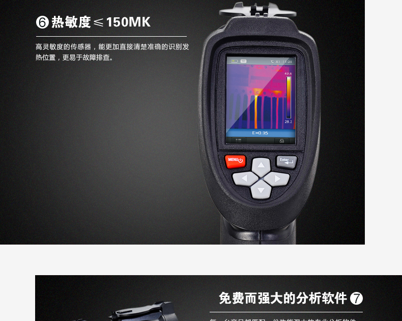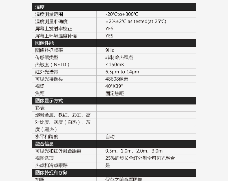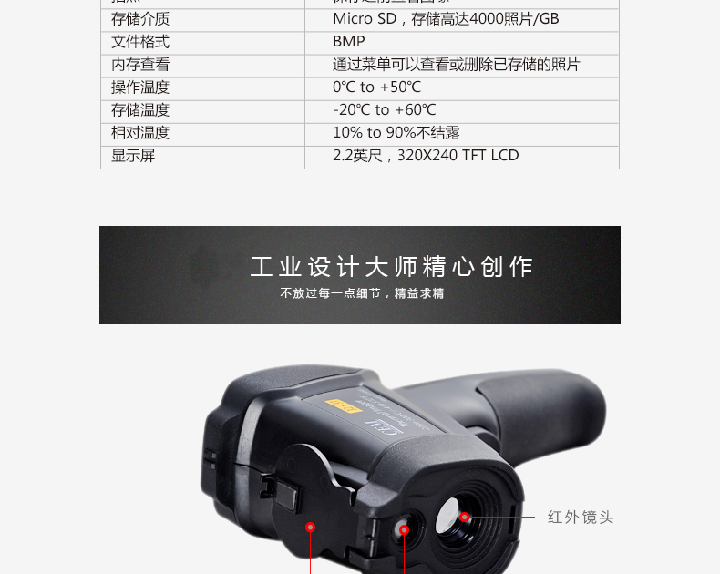 2.2寸TFT 320*240像素彩色液晶顯示屏;分辨率32*31像素;圖片捕獲頻率9Hz;熱靈敏度;自動(dòng)追蹤標(biāo)識(shí)區(qū)域內(nèi)最高溫和最低溫;拍照功能;支持MicroSD儲(chǔ)存卡和數(shù)據(jù)記錄功能;時(shí)間/日期/設(shè)置,可調(diào)輻射率和鎖屏;可充電鋰電池;支持USB接口;語(yǔ)言種類:英語(yǔ);Meterbox IRTP 和云儲(chǔ)存