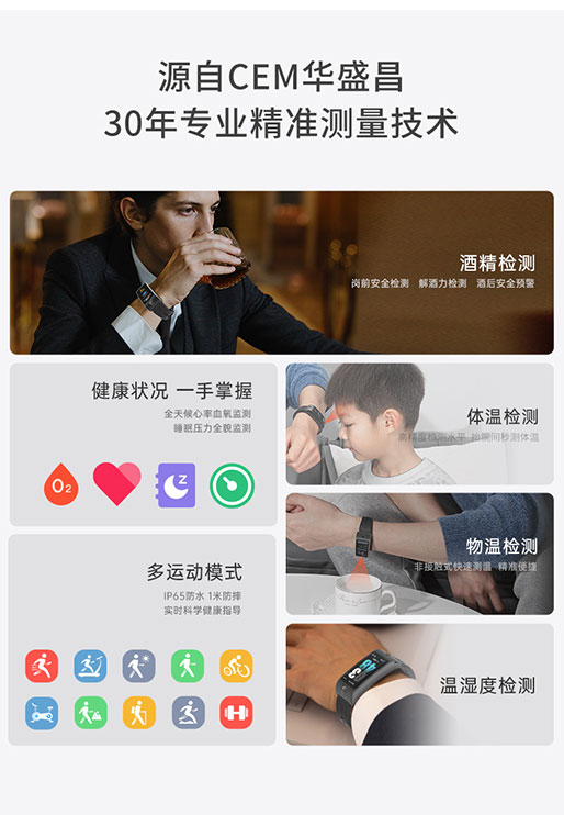 CEM路卡智能專業(yè)酒精檢測手表體溫檢測運動健康監(jiān)測物溫環(huán)境溫濕度M90X 時尚版本