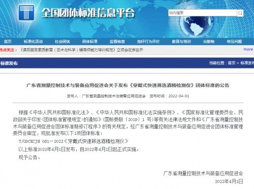 近日,由我們總公司深圳市華盛昌科技實業(yè)股份有限公司牽頭起草的《穿戴式快速篩選酒精檢測儀》團體標(biāo)準(zhǔn)審定會已經(jīng)過廣東省測量控制技術(shù)與裝備應(yīng)用促進會的審查,《穿戴式快速篩選酒精檢測儀》團體標(biāo)準(zhǔn)于2022年4月1日在全國團體標(biāo)準(zhǔn)信息平臺正式發(fā)布并實施。