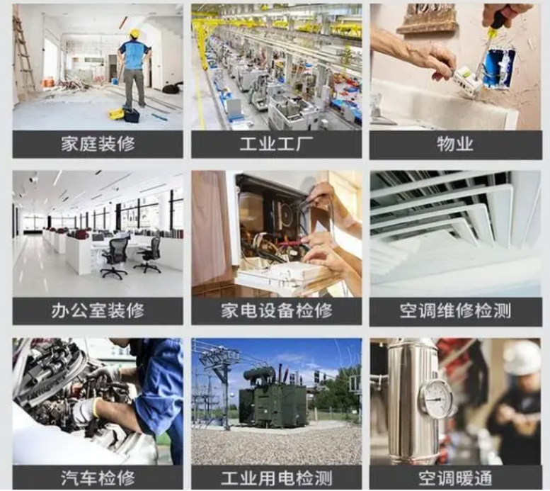 用于家庭或辦公室裝修、物業(yè)維修、家電設備檢修、汽車檢修、工業(yè)用電檢測等場景。