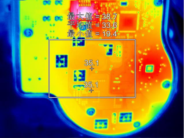 使用紅外熱像技術(shù)對(duì)PCB電路板進(jìn)行發(fā)熱測(cè)試。下圖為PCB電路板的發(fā)熱情況測(cè)試,需要觀測(cè)PCB電路板表面的溫度分布情況,來(lái)確認(rèn)是否處于工作溫度內(nèi)。